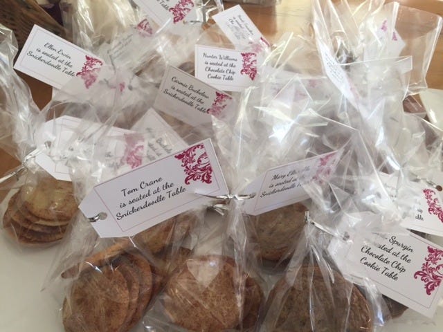 So, a bag of snickerdoodles with your name on it? Snickerdoodle table. Brownie Cookies? Brownie table. Thin Mints? You get my drift.
